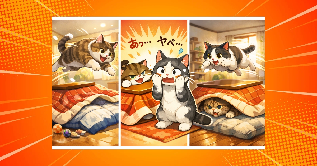 最近、コタツという新たなアイテムが加わりました。ここは主戦場となり、普段クールな月丸が巨漢のののに不意打ちを仕掛けることもしばしば。腹を見せて醜態をさらし、寝起きの私と目を合わせる瞬間には「あっ、ヤベー」という表情がセットでついてくるのです。