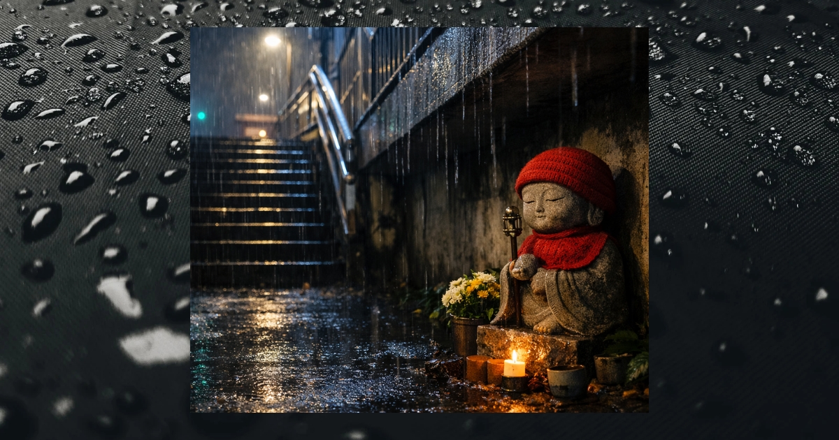 その待ち時間、歩道橋の下で雨宿りをしていると、普段は目に入らない場所に小さな地蔵様がひっそりと置かれているのに気づきました。